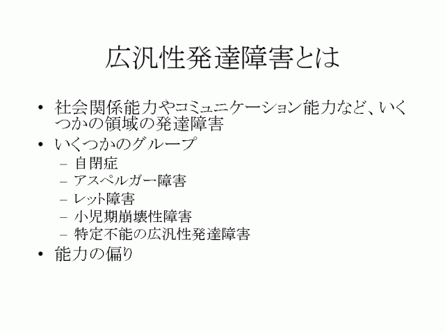 今自閉症と言われていますが、正しくは「広汎性発達障害]というくくりの方が適切のようです。広汎性発達障害というのはアメリカ精神医学会という大きな学会で認められた障害名ですが、おおむね発達時期に見られて、ひろく障害をうけるという事です。何処に障害が見られるかというと、社会関係能力、人との付き合いとか、そういったところに障害がある、あるいはコミュニケーションですね。言葉を話す、理解するというあたりに困難が見られるグループだと言われています。広汎性発達障害にはいくつかのグループが知られていまして、1つ目は「自閉症」、2つ目は「アスペルガー障害」というグループです。よく高機能自閉症とも言っていますが、表現が失礼ではないかという方がいまして、つまり「高機能」自閉症というのに対して「自閉症」は「低機能」自閉症というのかと反対する方もいます。精神医学会では「アスペルガー障害」という名称を使っています。高機能自閉症というのは使っていないですね。文部科学省は高機能自閉症を使っていますから間違いではないですが、私自身は「アスペルガー障害」と使っています。あとは「レット障害」という、自閉プラス脳性マヒのようなグループがあります。女の子にしか見られないというものです。私も文献でしか見た事がなくて実際には会った事はありません。もうひとつは「小児期破壊性障害」と言われるもので、ある時期言葉があったんだけれどもある一定の時期になると言葉が消失していって自閉症の症状を示すというグループです。最後に「特定不能の広汎性発達障害」というものでこれはどういった障害かと言いますと「自閉症」のようなんだけれども「自閉症」ともちょっと違う、「アスペルガー障害」とも違う、「レット障害」とも違う、「小児期破壊性障害」とも違う、従って残り全てをひとくくりにしたようなものです。広汎性発達障害というとこれらのどれかに入るグループという事です。ですから自閉症と言われた場合、広汎性発達障害と言っても間違いじゃないという事です。