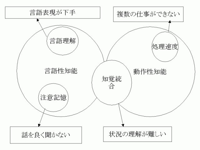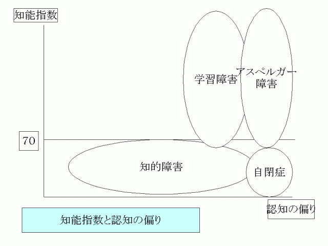 「知能指数」と「認知の偏り」(アンバランス、得意・不得意の幅の大きさ)という尺度でいくつかのグループを表わしてみます。知能指数IQ70がひとつのめやすです。あくまでもひとつのめやすですので、数字にこだわらないでください。上に行く程、高いです。我々平均人はだいたいIQ100くらいの所に位置します。得意・不得意もそんなにない。知能指数も100前後というふうに言われています。知的障害の方々というのはだいたいIQ70より低いと言われています。あくまでもめやすです。能力のアンバランスもそんなに大きくない。左にいく程能力のばらつきが小さいですね。自閉症と言われているお子さんの場合には、「認知の偏り」がすごく大きい。そしてだいたいIQ70よりも低いと定義されています。アスペルガーの場合には「認知の偏り」が非常に大きくて、だいたいIQ70前後から高い人でいうと130から140という方もいます。中にはIQ150・160という、もうこうなるとアスペルガーと言わないですね。サヴァン症候群と言われています。知られているのはカレンダー才能・音楽才能・絵画才能といったものです。「西暦2035年6月21日は何曜日ですか」と聞くと「月曜日」とぱっと答えます。本当に月曜日かどうか分かりませんけど、そんなふうにすぐに出て来ます。けっこう居ます。カレンダー才能を持っている方。あと絵画才能、数が数えられないのに新潟の町を書かせるとビルの窓、線がいくつあるのか正確に書く。だけれども数は数えられない。どうやって記憶しているのかというと、おそらく写真を撮るような感じで、パシャッとシャッターをきって、その中にそのまま記録している。なんとかビルの窓は20×20個なんていうふうには記憶していない。見たまま記憶しているという事ですね。裸の大将で有名な山下清さんもサヴァンと言われています。絵画才能ですね。大江健三郎さんの息子さんの大江光さんもたぶんそうだと思われます。新潟でいうと新井の岡田さん、あの方も話をするのは困難ですけれども、目で見て記憶して再現するという能力が我々に比べてものすごく優れています。だけれども、話すとか、生活するという能力が弱いという事が言えると思います。LDと言われているお子さんの場合には70くらいからで高いんだけれども、「認知の偏り」がまぁまぁある、アスペルガー程ではない。じゃあいったいこの辺どういったふうに線が引かれるかというと、よく分かっていません。重なり合っているのかもしれないし、そうじゃないのかもしれない。あるいは別のグルーピングが出来るのかも知れない。今はこういうふうな名前で言っているけれども、ひょっとしたら違う、この辺(学習障害の下部とアスペルガーの下部)で1つのグループなのかもしれないし、この辺(学習障害の上部とアスペルガーの上部)で1つのグループなのかもしれない。だけどよく分かっていない。という事なんですね。従ってよく私は学校の先生に言うんですけれども、この子が学習障害なのかアスペルガーなのか知的障害なのか、そういった診断にこだわる必要はないんだと。そうじゃなくて、この子にいったい何をしてあげる事が一番必要なのかという事を優先的に考えて下さいと言ってます。医者みたいにいろんな検査をやってこの子は学習障害で何の学習障害なんだろう、なんていうふうに一生懸命時間を費やしても、仮にこの子の障害名がはっきり分かったとしても、指導になかなかつながりません。むしろこの子にとって今必要なのはこれだ、でやってみた、ぴったり合った、じゃあその指導を続けよう。この子にとってこの指導がいいんじゃないかと思ってやってみた、ちょっと合わなかった、じゃあ修正してもう一回やってみる。というような姿勢が必要だという事を学校の先生には言っています。