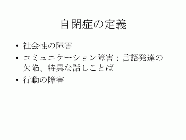 それでも自閉症の子供は理解されなくて、逆に自閉症でない子供と同じような扱いをされて大変な苦労をして、場合によっては学校に馴染めずに、あるいは不適応を起こし、「この子は問題だ」とラベルを貼られている子供達もかなり居るんじゃないかと思います。お母さん方はかなり勉強をされているかと思いますので、分かっている事もたくさん出てくるかと思いますが、一応自閉症に対する理解の復習の意味も込めて話をしていきたいと思います。