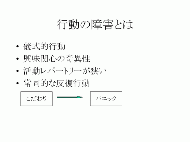 儀式的な行動。学校へ行く前に必ず何かを並べていかないと気がすまないとか、部屋の本がきちんと揃っていないとダメとかいう事です。どう見ても意味のないような事を毎日毎日繰り返しやっている、「やらなくてもいいんだよ」と言ってもやる。本人も楽しそうでない時もある、苦しそうにやっている時もある、だけれども止めると怒ったりする、「いいよ、やらなくて」なんて言うと怒る。さらに止めるとパニックを起こす。つまり「活動レパートリーが狭い」、出来る活動、好きな活動が少ないという事です。決まった活動しかしない、水遊びだけとか、ミニカーを並べるだけとか、そういった事しかしない、別の事をやらせようとすると抵抗する。「常同的な反復行動」、儀式的行動というのはこの事ですが、こういったものが「こだわり」と言われるもので、こういった事を常にやろうという「こだわり」、それが強いと止めるとパニックを起こします。泣いたり、かみついたり、自分を叩いたりというのが知られています。