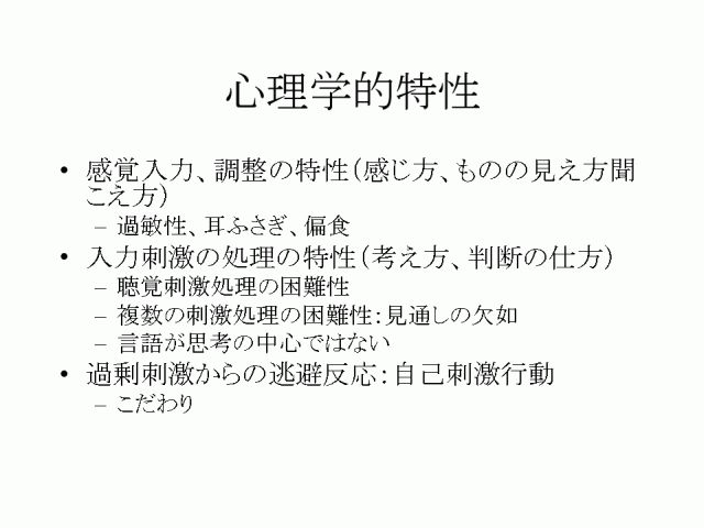 「自閉症」と「アスペルガー」との違いはいったい何かという事ですが、「自閉症」というグループがあって、その次に何かのグループがあって、その次に何かのグループがあって、その次に「アスペルガー」があるという、連続しているというふうに考える学者がいます。そうじゃなくて「自閉症」と「アスペルガー」は違うグループだと考えている学者もいます。じゃあ「自閉症」と「アスペルガー」の違いは何かというと、言語発達の遅れがあったか、ないか、だけです。つまり言葉をぺらぺらと普通に話す自閉症が「アスペルガー」だと、言葉をうまく話せないとか、あるいは知的な遅れがある子供は「自閉症」と考えられています。だからどこに区切りを付けるかっていうのはなかなか難しいです。指導的な立場の人達から見れば「自閉症」と「アスペルガー」を区別する必要はなくて、やはり心理学的な特性とか行動特性は非常に似ていますので、同じように扱っていいと思います。ただ「アスペルガー」の子供達の場合には普通に話すんですね。普通以上に話す子も居ます。で、その言葉に先生はだまされるんです。言葉でぺらぺら言っているから分かっていると思うんですね。ところが分かっていない事が多い。もう興奮して「僕、最後までがんばる」とか言いながら頑張らなかったり、「パニック起こさない」と言ってパニックを起こしている。言っている事とやっている事が一致しない場合が見られます。先生にすると「どうしてちゃんと分かっているのに出来ないんだろう」という謎を抱えてしまうんです。そこで自閉症の心理学的特性という事になるんですが、1つは「感覚入力・調整の特性」もっと分かりやすく言うと「感じ方・ものの見え方・聞こえ方」が自閉症ではない子供達と違っているという事です。非常に過敏であるという、触られる事を嫌がる、あれはもう、嫌な表現ですが大キライな人になでられる事を想像してください、そういう感じです。嫌ですよね、やっぱり。感覚が過敏である自閉症の子供は常にそういう事を体験しているというふうに考えた方がいいです。テンプル・グランディンさんは大学の先生でアスペルガーの方ですけれども、自伝に書いていますよね。「ギュっと抱き締めてもらいたいだけれども、抱き締められる感覚が嫌、人にされる感覚が嫌」だから自分を締めつける機械を作って、その締めつけられるという事で安心感を覚えたという、本当に矛盾していますよね。ギュっとして欲しいんだけども、その感覚が嫌という、その過敏性が1つ言えるんじゃないでしょうか。この過敏性は皮膚感覚だけじゃないですよね。味覚もそうです。あるいは目で見る刺激もそうです。いろんなものの感覚が過敏であったり、鈍感であったりします。運動会である「バーン」っていうのをすごく嫌う子供もいますけど、おそらく大砲の弾丸を飛ばす音くらいに聞こえるんじゃないかなと私は思うんです。それを「大丈夫だよ。我慢しなさい。」なんていう先生もいますが、我々に大砲のそばに立って我慢しろと言っているようなものなので、そういう特性を理解してあげなければいけないわけですね。だから結局嫌になったら耳塞ぎを始めるという事になります。それでも音というのは聞こえて来ます。じゃあどうするかというと、自分が気に入っているフレーズを何度も繰り返します。「いつも楽しく気ままな…」とかいうCMのフレーズを何度も何度も口ずさむ、嫌な音をマスキングして消してしまおうとしているんですね。だから不安定になると耳塞ぎをしてCMを何度も言うというのは彼らのささやかな抵抗なんですね。当然味覚にも過敏であったり鈍感だったりするので、偏食があります。例えば「とってもおいしいから食べなさい」と言ったものが砂を食べているかのような感覚であるかもしれない。ですから私が自閉症の子供の偏食の指導に関して質問を受ける事があるんですが、答えは「栄養のバランスが取れていれば偏食なんか改善する必要はない」という事を言っています。食べたくないものを食べさせなくても良い。ただ、あまりにも偏っている場合、私が知っている例で言えば、サーモンステーキとビーフステーキしか食べないという方がいらっしゃいましたが、そういう状態では困る訳ですね。だけれども、健康に影響がない程度であれば偏食があっても良いと思います。ちなみに先ほどの例に出した中田選手ですが、彼が野菜を食べないのは有名な話で、お母さんが「野菜食べないと中田選手みたいになれないわよ」と言うのは実は通らない話です。ですからそんなに神経質に考えなくても良いと思います。次が入力刺激の処理の特性(考え方、判断の仕方)が違っているという事です。耳から来る刺激を処理するのが苦手であるという、よく自閉症の子供にとうとうとさとす人がいますけれども、あれは全く効果がありません。ある一定の言葉以上になるとただの雑音