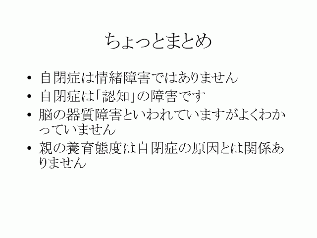 じゃあここで1つにまとめたいんですけども、自閉症というのはよく情緒障害と言われていますが情緒障害ではありません。認知の障害です。認知の障害が結局は関わり方、対応の仕方が適切ではなくて情緒障害を引き起こす。つまりパニックを起こす状態ですね。だからもともと自閉症とパニックはセットではありません。自閉症だからパニックを起こすという事ではなくて、彼ら自身に対する関わり方が適切でなかったり、彼ら自身が訴え方が分からなくてパニックという形で訴えているというふうに捉えた方が適切であろうと思います。脳の器質障害と言われていますがよくわかっていません。最後に、親の養育態度は自閉症の原因とは全く関係ないという事です。完全にこれは否定されています。1970年代は親が原因だと言われていましたが、今は100%否定されています。