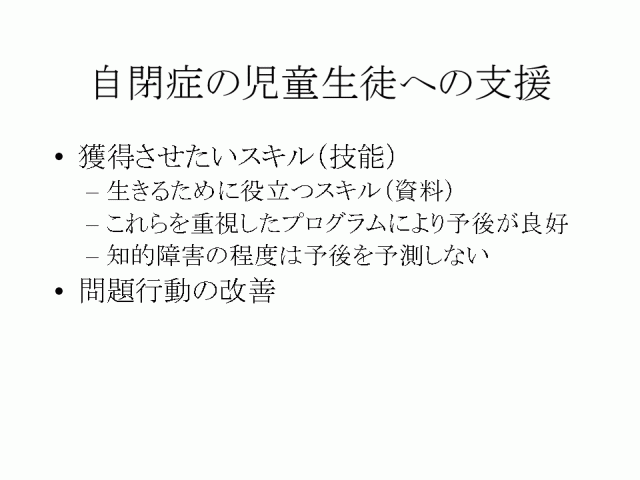 じゃあ、自閉症やアスペルガーの子供たちにどういった支援が必要かという事ですが、獲得させたいスキルがあります。これは具体的に出来る事という事です。もっと具体的に言うと生きるために役立つスキル、10のスキルが知られています。コミュニケーション・身辺自立・家庭生活・社会性・地域資源の利用・就労・実用的な読み書き計算・余暇・自己決定・健康安全の10ですね。これらのスキルが身に付くという事が、生きる為に役立つ事になりますし、これらを重視した指導が将来を明るくします。つまり教科学習、国語・算数・理科・社会という勉強よりも、ここに書かれた10のスキルの力が身に付くという事が将来の予後が良い、というのは調査ではっきり知られています。特に社会性・コミュニケーションに関しては、言葉をぺらぺらと話せる必要はありません。何が出来ればいいかというと、挨拶ですね。「おはようございます」「さようなら」「ごめんなさい」「教えてください」「ありがとうございました」といった挨拶が出来る事、必要最小限の人付き合いが出来る事、これに尽きます。お世辞を言うとか、付き合いで酒を飲むとかいう事が出来る必要はありません。別にこういった事が出来なくても会社の経営者は良いと言います。必要なのはとにかく挨拶だと。最後まで仕事をするというのは自閉症の人は得意な事ですから。あとは身辺自立です、当たり前の事ですが、特に強調したいのは食べ方とトイレの使い方です。特にトイレはトラブルのもとになります。トイレをきちんと使えるか、使えないか。知らない所でも用を足せるか、足せないかですね。字を書けるとか計算出来るとかいうのは就職のバロメーターにはなりません。言葉を話せなくても仕事をしている自閉症の人達は沢山います。ですからそういった身辺自立・挨拶・最後まで仕事をするといった事が出来れば十分可能だという事です。もう1つは余暇、趣味がある、好きな事があるという事は非常に大事です。将来の充実した生活に余暇というのはもっとも重要なスキルだと言われています。どうやって余暇・レジャーといわれるスキルと身に付けるかというと一言でいうと小さい頃から親子で楽しめるものをもつという事ですね。小さい頃からあらかじめ慣れさせて電車やバスに乗って旅行をする、電車の時刻表を見る事を覚える、あるいは目的地の観光資源を知る、そういったものをどんどん発展させていく。私の知っている自閉症の方は今は一人で電車に乗って(鉄道同好会かなんかに入っている)ユースホステルかとかに泊まって一人で旅行していくらしいですね。その出発点となったのは親子で旅行した事なんですね。そういうことが有効だという事です。あとはIQ、知的障害の程度はその予後を予測しません。IQが高いからその予後が明るいとか、IQが低いから、あるいは予測不能だからといって予後が悪いとかいう事はありません。実際に横浜で調査をした方が重度でも就労しているという自閉症の人は沢山いるという結果が出ていると言っています。あとはスキルの獲得と問題行動の改善の2本柱だと思います。