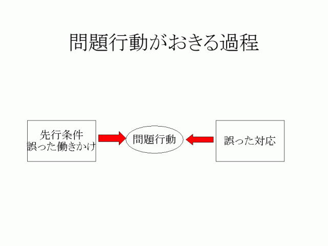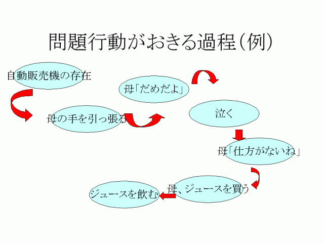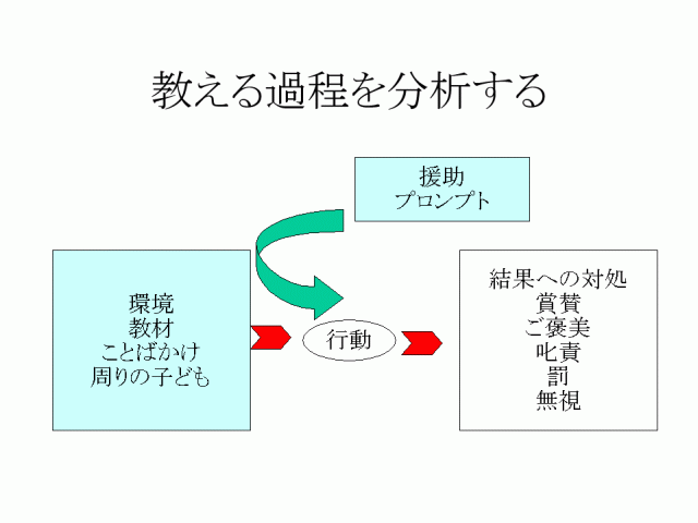 子供に何かさせたい、「おはよう」を言わせるでもいいですし、お手伝いをするでもいいですし、あるいは「はい」と手をあげるでもいいです。何かをやらせたい、やって欲しい時、やるかやらないかだけ見るんじゃなくて、ある1つの行動を行う直前の様子を見て欲しいと思います。例えば「パニックを起こした」場合、パニックを起こしたというのをどうこう責める前に、パニックを起こす直前の様子を見て欲しいです。例えばどういう状況の時にパニックを起こしたのか、そばにどういう物があったのか、誰がどんな言葉を発したのか(「ダメだよ」と言ったのか、あるいは「やりなさい」と言ったのか)、周りにどんな子供が居て、どんな態度をとっていたのか、などいろいろあります。学校で言えば何の時間だったのか、どういう学習をしていたのか、などという事が考えられます。もうひとつは、何かの行動をおこした後にどういう対応をしたのか、パニックを起こしたという行動の後に褒めたのか、ご褒美を与えたのか、叱ったのか、罰を与えたのか、無視したのか、周りの態度はいろいろあります。ですから、「パニックを起こしました。どうやったらパニックは治りますか?」という事を考える場合、そのパニックを起こした状況をよく見るという事と、その後どんな対応をしたかという事を具体的に見るという事です。「やさしく接したのにパニックを起こした」という場合、やさしくというのはどういう事なのか、「やさしく撫でたのにパニックを起こした」というのは過敏だからパニックを起こしたという事になります。ですから「やさしく」というと非常に適切な事をやったように聞こえますが、具体的に見てみると適切でなかったという場合がけっこうあります。こんなふうに子供の行動を見る場合には、前の様子と後の様子を必ず見る事です。これが分からないと対応の仕方は見えてきません。ただ、前の様子と後の様子と、もうひとつ大事なのは援助ですね。子供が名前を呼ばれた時に「はい」と手をまっすぐあげられなかったとします。そうすると指導者は何をするか後ろから支えて「こうやってあげるんだよ」とやったりもしますし、前に立って「先生の真似をして手をあげてごらん」と言ったりもします。こういうのを英語でプロンプトと言います。つまり援助です。日本語で言うと促進するという事です。3つ知られています。1つは「こうこうこうしなさい」という言葉でのプロンプトですね「言葉掛け」と言います、2つ目は「モデリング」モデルの人がいて真似してもらう、「模倣」とも言います。「こうやるんだよ」と実際にやってみせる。ラジオ体操でモデルの人が前にいて、それを見ながらやるというのはモデリングが出来れば出来ます。3つ目は「身体的な介助」、さっきの手をあげるという話で出てきた、うしろから支えて「こうやるんだよ」というふうに手をあげさせる。あるいは「ちょうだいというのはこうやるんだよ」と手を押さえて形を作ってやる。席に座るのも「座りなさい」というのは「言葉掛け」で、身体を押さえて座らせるのは「身体的な介助」です。そういう援助というのは非常に大事な支援ですので、おおいにやって頂きたいですが、大事な事は出来るようになるに従って援助することを引いていく事です。いつまでも「こうやってあげるんだよ」と肘を押さえていると子供は自分でやろうとしなくなります。名前を呼んだ、「こうやるんだよ」と後ろの先生が介助した、これを続けていくと、名前を呼ばれた時に後ろを見るようになります。介助を要求するようになります。ですからそういう援助はどんどん減らしていく。出来るようになったら減らしていく。自転車を乗る為の練習をする時には出来るようになると援助を減らしていきますよね。あれと同じで、出来るようになったら引いていくやり方が適切であろうと思います。