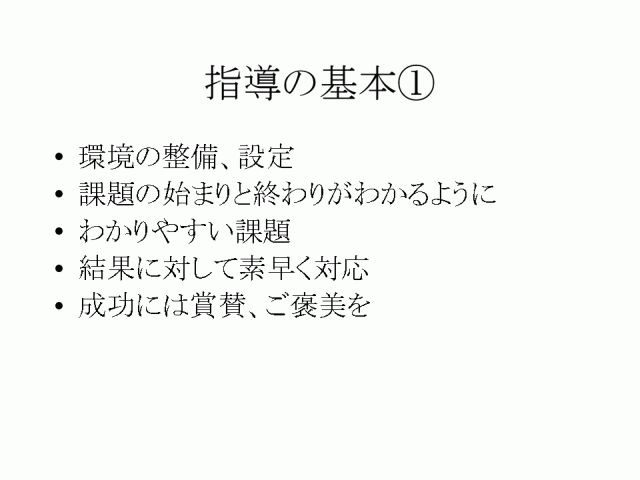 教える時には環境の整備、設定、教えるにふさわしい環境を作る。例えば「掃除をしましょう」といった時には、その場が掃除をするというのが分かる環境であって欲しいです。なんにもない所で「さぁ、掃除をしましょう」では意味が分かりません。散らかっている、ゴミがいっぱい落ちている、そういう状態に置かれると「掃除をしましょう」という意味が分かりやすくなります。次は課題の始まりと終わりが分かるように、何かをさせたい時にはスタート・ゴールが分かるように。例えば「この1本の板を切って下さい」。スタートは切ります、真っ2つになります、終わったというのが目で確認できます。それが「できるだけ沢山シールを貼りましょう」という課題は分かりにくいです。この前教育実習の指導に行ったら自閉症の子供にやらせていました。なんかシール貼っているんですけど、飽きて他の人にちょっかい出してます。で、学生に「この子何個シール貼ればいいの?」と聞いたら「出来るだけ沢山です」と言うんです。最初に10個なら10個と決めて、終わったらさらに10個というのなら分かりますが、出来るだけ沢山というのは分かりにくいですね。あとは「丁寧にヤスリかけをしなさい」というのも分かりにくいですね。どこまでやれば丁寧なのか。よく行うのはチョークで板に色を塗って「この色がなくなったら終わりだよ」という言い方をします。「それまでサンドペーパかけなさい」という言い方をします。つまり仕事の始まりと終わり(結果)が分かるような指示を出せという事です。次にわかりやすい課題であるという事、これは当然ですね。子供が分かるような課題。結果に対しては素早く対応して欲しいという事。それが間違いであったら「間違いだよ」とすぐ教えて欲しいです、正しければ「正しい」とすぐ教えて欲しいです。で、成功した場合には賞賛して欲しい、ご褒美を与えて欲しい。このご褒美ですが、よく勘違いをされるんですね。食べ物をやるとか、そういった事も効果はありますが、まず褒めるという事。口で褒めるという事。と、子供の好きな物を与えるという事。好きなものというのは、おもちゃ、あるいはシール、食べ物、好きな活動、好きな場所、好きな人、いろいろあります。従ってこの子が好きな物は何かをリストアップする必要があります。学校の先生には1人1人の子供の好きなものの一覧表を作って記録してくれと言ってます。ケーキを与えて喜ぶ子供もいれば、ケーキを与える事が罰になる子もいるんですね。私の出会ったダウン症の子供がそうでした。甘い物は絶対食べない。誕生会でケーキを出すとすごく嫌な顔をされて、他の子は喜んでいるのにどうしてだろうと思ったら、小さい頃から甘い物は一切やっていないとお母さんがおっしゃっていて、結局ダウン症は肥満になりやすいから小さい頃から制限していたんですね。だから人によって喜ぶ物は違います。従ってその子が喜ぶ物を与えるという事です。で、褒める時には具体的に、何が良かったのかを具体的に言ってあげて下さい。「よくできたね」という褒め方はいまいちですね。「10個言われた物を作ったね。がんばったね」は○です。「ゴミを捨ててくる事が出来たね」も○です。「掃除を頑張ったね」これは×です。何がどうして良かったのかが分からないからです。褒める時は子供が頑張った事を具体的に言ってあげて、だからあなたは偉いんだという言い方をします。
