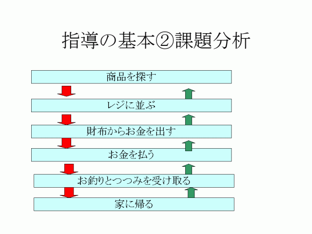 何かをさせたいという場合には、目標を決めて目標に至るまでの道筋を細かく分析してください。例えば「買い物をする」コンビニに行って商品を買うという事をさせるとします。商品を買うという事は図のような流れになります。この子は「買い物ができません」といった場合に、どこが出来ないのか。例えば「商品を探す」という事だけが出来なければどうなりますか?これが出来ないと後が進みません。そうするとこの子は買い物ができないという言い方をされます。もし、「商品を探す」事だけがつまずいていた場合、それを先生がやってあげれば以降は出来る訳ですよね。もう買い物は80%出来てる訳です。従って「買い物」という1つの行為を考えた時にそのステップを細かく分けてみて下さい。案外難しいのは「財布からお金を出す」です。必ず最初はまき散らします。これはけっこう家で練習していないと難しいですね。で、指導の基本はこの順番に教えていけばいいわけですね。「はい、商品を探してごらん。どこにあるの?」例えば絵カードを使ったりして「これと同じ物はどれ?」とか言って選ばせます。「はい、レジは何処ですか?」と言ってレジに並びます。で、「財布からお金を出す」「お金を払う」…というふうに指導していきます。ところが「財布からお金を出す」だけが出来ない子供にはこの手順でもいいですが、言葉の理解もなく全く買い物はした事がないという子供の場合には「これから買い物をしましょうね」と言ってコンビニへ連れていく、「まず何をやるの?商品を探すんだよ」と言った途端にもう居なくなっていて店内を走り回っていて、何か商品を握りしめているので「ダメダメ」と言っているうちにそっちに行った、で鬼ごっこが始まって「あ〜、これで買い物学習打ち切り!」となってしまってそれ以降はやらなくなる。じゃあ、どうするかというと、先生と一緒に「商品を探す」「レジに並ぶ」「財布からお金を出す」「お金を払う」までやって、ここで学習が始まります。「お釣りとつつみを受け取る」です。つつみを「はい、受け取ってごらん」と言って受け取らせて「はい、帰りましょう」で、「買い物出来たね。偉いね。」と、そこで成功して終わります。次に今度は「財布からお金を出す」までを先生と一緒にやって、そこから子供にやらせます。つまり、ゴールからスタートに戻ってくる訳です。店に入ったら、手をつかんで商品の所まで行って商品を入れて、レジに並んで、お金を出してやって、その次は子供にやらせるというふうにします。そうすると「買い物学習終了」「成功しました」先生も褒める事が出来た。子供も商品を受け取って食べる事が出来た。ここまでが出来るようになったら、次に「お金を払う」所からやらせてみるというふうに、出来るようになるに従ってスタートに戻っていくという、スタートからゴールの順番でやるやり方もあれば、ゴールからスタートに戻るやり方もあるという事です。衣服の脱着の指導もこの逆にやります。ズボンを最初から自分でやるのは無理なので、ズボンをはかせてホックも止めて、最後に子供にファスナーを上げる事をやらせます。それで「ズボン一人で履けたね。良かったね。」で終わります。で、それが出来るようになったら今度はファスナーも下げた状態から「やってごらん」で、出来たら「出来たね」と、だんだんと難しくしていく訳です。ですから着がえの指導はスタートからやらせようとすると失敗します。従って最初は全部やってあげてから最後の所だけをやらせます。ボタンもそうですね。ほんのちょっとで出来るような状態にしておいて「やってごらん」と言って出来たら「出来た!」という所で終わりにします。勉強というのは始まってすぐ終わり、成功して終わりにします。それを最初からやって長々とかかってそのうちこっちもイライラしてくると悪循環になって子供も嫌な思いをするし、指導者も嫌な思いをします。基準を低めにとってだんだん基準を高くしていくのが指導の基本です。