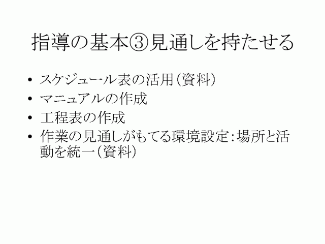 自分がこれからやろうとする行動の流れが分かるという事です。自分がこれから過ごす1日が分かるという事です。従ってスケジュール表を活用します。スケジュール表というのは例えば1時間目は何、2時間目は何、というように1日の流れが分かるような表の事です。言葉が分からなければ絵でもいいですね。で、最初から沢山盛り込む必要はありません。分かるくらいのものを入れていく、だんだん分かるようになると1時間目国語は何をするという活動内容まで入れていきます。そして大事な事は出来た時には出来たというチェックをします。最初は先生(指導者)がやってあげてもいいですね。だんだん出来るようになったら自分でチェックをさせます。1時間目国語、漢字の書き取り10問出来た、シールを貼る、2時間目算数の問題出来た、シールを貼る、で最後にシールが5個たまったら何かご褒美をもらえるという事をやると一生懸命頑張ります。その都度、その都度ご褒美をやるというのはやる方も大変なんですね。だからご褒美は1日の最後に取っておいて、そのご褒美をもらえるんだよという合図としてシールをあげたりポイントをあげたりチェックしたり○をあげたり、「もうちょっとで5個になるよ、頑張ろうね」といって最後までひっぱっていきます。学校ではなかなかその子だけにご褒美をやるというのは難しいんですね。従って先生がポイントを与えて「これをお母さんに見せなさい」と言って、家に帰ってお母さんに見せて、お母さんが「1日頑張ったんだね」と言って「はい、おやつ」というようにご褒美をもらえれば、学校でのご褒美と家での大きなご褒美が結びつく訳ですね。家だったらどんなに特別なものをあげても「不公平だ」とは言われませんので、そういった部分は学校の先生と親とが連携してやるというのがいいと思います。あとは子供が出来るような見通しがもてるようなマニュアルを作成します。ちなみに日本マクドナルドは知的障害の人でも分かるようなマニュアルを作って教えているそうです。よく工程表なんて言うのを作ると見通しが持てます。もうひとつは作業の見通しがもてる環境設定をするということです。場所と活動を統一するという事です。