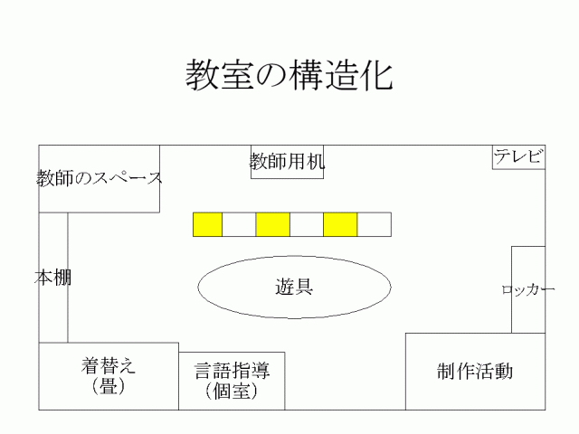 これは教室の構造化で、TEACCHの考え方ですね。つまりその場所で何をするのかが分かるという事です。教室があります。制作活動のコーナーは、ものを作る活動だけに使います。そこにはクレヨン・はさみ・糊とかがありますので、そこの場所に連れていくと何をしなきゃいけないのかが分かる訳です。連れていくとすぐに作業に取りかかる事が出来ます。「これからなになにの勉強を始めます。礼。」なんて言わなくても授業がスタート出来るというわけです。他に「言語指導の個室」、言葉の1対1のトレーニングに使います、「着がえのスペース」「本を置くスペース」「遊具を置いて遊ぶスペース」「自分のものを置くスペース」場所と活動、場所と物が一致するように教室を構造化します。こうすると子供は何処で何をすればいいのかが分かります。先生が場所を指さした、これだけで自分が何をすべきがが、繰り返していくうちに分かるようになります。これが「構造化」という手続きです。それを机をいつも丸くして同じ場所で給食を食べたり、国語をやったり、算数をやったり、言葉の指導をやったり、着がえをやったりすると、机の場所へ連れていっても何をすべきかが分からないんですね。だから机の場所は「お勉強コーナー」というだけにしてしまって、他はすべて違う場所でやるというふうに構造化します。