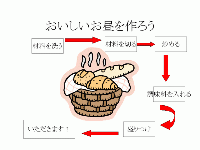これは工程表の例です。よく自閉症の人が(自閉症でなくても使いますが)使います、レシピと言われるものです。「材料を洗う」「材料を切る」「炒める」「調味料を入れる」「盛りつけ」「いただきます」と見通しが分かるんですね。パッと見ると自分が何をやればいいのかが分かるし、最後にどういう良い事が待っているかが分かります。ですから自閉症の人の場合には1つ1つページをめくるよりも、パーッとひと目で流れが分かるような設定の方がいいです。従って作業台も「材料を洗う場所」移動する、「材料を切る場所」移動する、「炒める場所」移動する、「調味料を入れる」移動する、「盛りつける場所」というラインを作って、その通りに動いていくと最終的に料理が出来上がりというものを作ってしまうと言葉が分からない自閉症の人でも料理が出来るようになります。