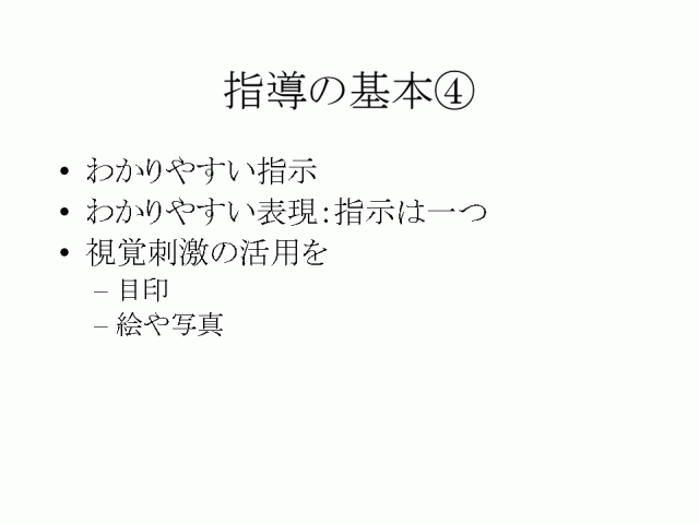 分かりやすい指示、分かりやすい表現、指示は1つです。「はい、授業が終わったので立って机の上を片付けてゴミはゴミ箱の中に。はい、○○ちゃんゴミは捨てに行って下さいね。」いくつ指示があったか? こうやっても混乱してしまいます。ですから「終わり」と一言言います。「はい、机の上を見ましょう。」と一言言います。子供は見ます。「えんぴつを片付けなさい」片付けて確認します。「ゴミはここ。」簡潔な指示を出します。「○○ちゃん、来なさい」目を見て「ゴミあるね。これはゴミ捨て場」と言います。ですから、指示は1語文・2語文で指示する。あと身振りを使う。あとはものによっては視覚的な刺激を使います。目で確認出来るようにする。目印を付ける、絵や写真を使う。良く使うのは1年生に入学した時に自分の靴箱の位置が分からない、従って先生が赤のマーカーで囲みます、「ここだよ」とすぐ分かるようにします。それをずーっと続けていると赤い所じゃないと入れなくなります。従ってこういう目印は分かるようになったら外していきます。「あなたの席はここだよ」とポケモンのシールを貼った、分かるようになった、ところがポケモンのシールがないと座らない、というふうにこだわる場合がありますので、だいたい80%くらい出来るようになったら指導者が少しルーズになって忘れた振りをして手がかりを置かないようにします。そうするとこだわる事が少なくなります。100%を求めないようにします。