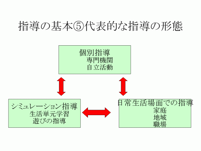 代表的な指導の形態に、1対1の指導があります、ごっご遊びのようなシミュレーションの指導があります、日常生活場面での指導があります。これらのそれぞれが大事です。つまりマンツーマンでやるのも大事、ごっご遊びで繰り返して行うのも大事、実際の場面で指導するのも大事、買い物であればお金の出し方を1対1で練習する個別指導も大切、買い物ごっこという教室でごっこ遊びするのも大切、実際に行って勉強するのも大切、どれも大切です。