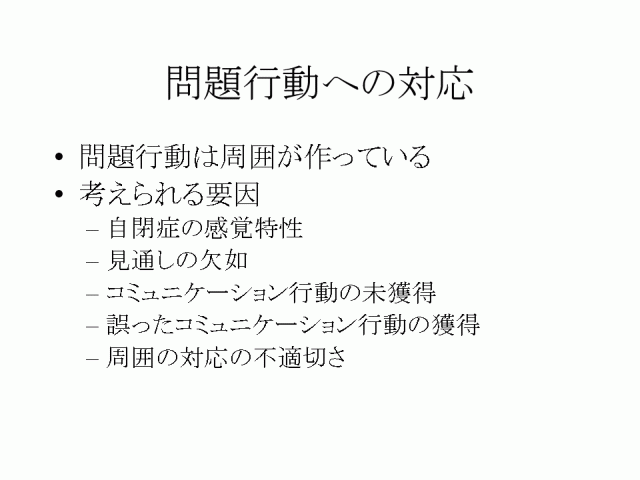 問題行動の基本は、問題行動は周囲が作っているというふうに理解して下さい。産まれた時から問題行動を示す自閉症のお子さんはいません。という事は周りが適切でない関わりをしていたという事になります。適切でないというのは彼等に対して適切でないという事です。考えられる要因は自閉症の感覚特性、さっき言ったように過敏であるとか鈍感であるとか感覚が違っているという事。次に見通しが持てない、コミュニケーション行動がまだ獲得していない、誤ったコミュニケーション行動を獲得してしまった。泣いて自分を訴えるとかですね。これに対して周囲の対応が不適切であったという事が考えられます。例えば泣くという事ですが、「この子は自動販売機の前に行くと泣くんですよね、困ったものなんですよね。」とお母さんが言います。その由来といいますか流れというと自動販売機がある、そもそもこれがいけないんですが、自動販売機を見た、その子は「んー!」とお母さんを引っ張った、お母さんは「ダメだよ」と言った、その繰り返しをやっているうちにとうとう泣いた、周囲が「何?なんだ、なんだ?」という変な目で見た。お母さんは「仕方がないね」と言ってジュースを買い与えた。これを繰り返していくとどうなるか?自動販売機を見ると泣くようになります。自動販売機を見た、泣くという連携が出来てきます。つまり問題行動、困った行動というのは先立つものが必ずあります。2つ目に適切でない対応が考えられます。従って適切でない働きかけによって問題行動が生じて、適切でない対応によって問題行動が長続きするという関係になります。先程も言いましたように、問題行動そのものだけを見るんじゃなくて適切でない働きかけと適切でない対応が大事だという事です。じゃあこういう事に対してどんな対応が必要かというと、1つは環境を整えるという事です。問題行動が起こりにくい状況にする、子供が混乱しないような状況を作るという事です。学習が分かりやすいような状況を作る、雑音がいっぱいあるのであれば雑音を取り除くとか、場所が混乱しているのであれば構造化を図るとか、そういう環境を整えるというのは非常に大事です。適切な刺激を出してやるという事、問題行動に対しては適切な対応をするという事。たいがいは消去、対応しない、問題行動に対しては答えない、もっと分かりやすく言えば無視するという事です。ただこれだけでは問題行動は改善しません。ではどうするか?問題行動を潰しにかかるのではなく、適切な行動を伸ばすようにします。問題行動を改善するという事は問題行動を無くす事よりも、正しい適切な行動を獲得させる事だと言われています。じゃあどうやって獲得するか?適切な行動に対しては適切に対応する、例えば「良く出来たね。こうやればいいんだよ。」というふうに褒めてあげる事をします。で、適切な行動がとれるように援助します。この2本立てでいきます。問題行動に対しては関わりを持たない。ただ良い行動に対しては最大限に褒めてやる。で、なかなか適切な行動をしない時にはプロンプト(援助)する。例えば「先生の注目を集めたくて服を脱いだ、それに対して周りが『わー!』と騒いだ。」そうするとその子はますますやるようになります。その時に服を脱ぐという問題行動を無視する、消去する。とどうなるか?ますます脱ぎ始めます。だから無視だけじゃダメなんですね。上着だけではなくてパンツまで脱いでしまいます、もう平気でやります。だからそういう事に対しては無視をする訳なんですが、その子が服を脱ごうとした時に、脇に付いている先生が「そうじゃないでしょ?『先生、僕を見て』って言ってごらん。」というプロンプトをします。で、その子が「先生、僕を見て」というような事を言ったら、その先生は「そうそう!そう言えばいいんだよ」と「先生はちゃんと見てるからね」と大げさにその子に注目してあげます。という事、この2本立てでいきます。「適切な対応。消去」だけでもダメ、「適切な対応。賞賛。ご褒美」だけでもダメ、両方やります。そして注目して欲しいという場合に問題行動を起こす場合には、もうひとつ適切な対応として時々注目してやるという、とにかく注目して欲しいわけですから、常に声を掛けてやればいいわけです。「がんばってるね」というごくごく平凡なやり方でいいわけです。「先生、ちゃんと見てるからね。」というふうに出来れば時計で計って、そろそろ5分たったなと思ったら「はい、がんばってね。」と声を掛けるというふうに、時間を決めて声を掛けると忘れなくて良いと思います。まぁそこまで几帳面にならなくてもいいですが。そして適切な行動に対しては大いに褒める、関わってあげると良いという事が大事だと言われています。この問題行動があまりにも激しい場合はどうするか?これには罰を与えます。罰を与えると言っても、殴ったりけったり