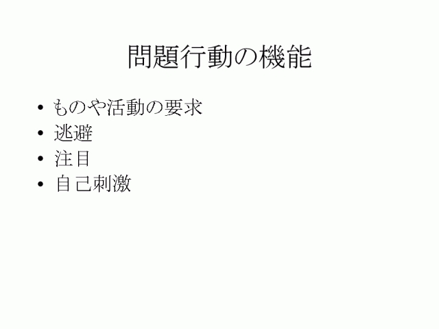 問題行動をなんでやるのか、いくつかの機能が知られています。つまり何かが欲しい、やりたいという事で誤った行動をしてしまう。その場から逃げたいという事で隣の人を引っ掻いたりしてしまう。注目して欲しい、これが一番多いですね。注意を得たいという事。あとはこれらが当てはまらない場合は自己刺激、つまりこうやって(何かを噛む)刺激してると心地よいという事なんですね。要求に関して、欲しくてかみついたとかいう場合には、正しい要求の仕方を教えます。「こうやるんだよ」と。正しく要求してきたら、すぐに応じてあげます。それを「おー、出来たじゃない。もう一回やってごらん。」なんていうふうにすぐに応じないと、やらなくなります。従ってちょっとでも良い行動が見られたら「よくできた!」とすぐ褒めてあげる。次に逃避。作業学習が嫌い・嫌だ・逃げたい・それで引っ掻いた、この場合には、我慢出来るだけの時間だけ作業させる。で、我慢できなくなった時には「先生、何処何処に行きたいんですけど。」というふうに言わせる。そしたら先生はすぐにその子を作業から解放させる。それを「みんなも頑張ってるでしょ。あなたも最後までやりなさい。」と言うのであれば、これはパニックを起こして全く良い事がありません。先生も迷惑を被るし、周りの子供も迷惑を被ります、本人自身も不快な思いをします。従って我慢できる限度までは我慢させるんだけれども、それ以上のものはさせない。別の活動をさせる、そのくらい柔軟に対応をした方が良いと思います。