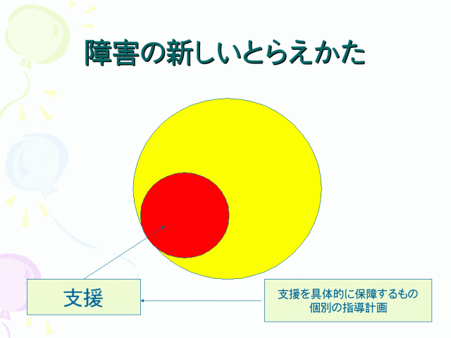 その他に、欠けていますが赤いものが入っています(図を参照)、まったく同じ大きさのものですからピッタリあてはまるわけです。そうすると、ちょっと色が違ってますけれどもやはりキチンとした丸になっています。こういう赤い丸の部分を、私たちは支援と呼んでいるわけです。ということは障害のある子どもというのは欠陥があるとみるのではなくて、こういう支援をしてあげればいろんなことができるようになるだろうという捉え方、決してどこか欠けてるとか曲がってるとか悪いということではなくてこのようなもの、ピッタリあてはまるもの、小さすぎても大きすぎてもダメで、ピッタリあてはまるものを入れてあげれば日常生活がみんなと同じように送れるということです。この赤い部分を支援ということです。