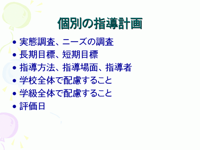 ニーズの調査ですが、最近は保護者・親の願いというものを学校も大事にしてきているようになっています。いい傾向だと思います。保護者の願いとあわせて教師の願いというのも必要になるかと思います。もっとも大事なのはやっぱり子どもの願いだろうと、親の願いでもなく教師の願いでもない、子どもの願いだということです。ADHDや高機能の子どもなどは、カウンセリング的なやりとりの中で「君はどんなふうになりたいの?」というような聞き方をすることがあります。誰々さんと友達になりたいとか、みんなから嫌われないようになりたいとか、これが本人の願いですね。やはり話せる子には、本人の願いを聞く保障をしてやることが大事だと思います。