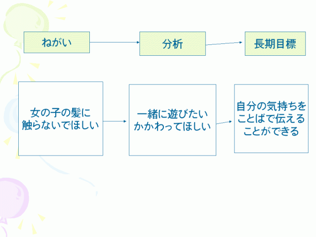 今のは長期目標といいまして、大体一年間を視野に置いた目標といえます。子どものニーズに基づいて設定する長期の見通しに立った目標、だから今すぐ出来なくてもいいわけです。こういうものに近づいてくれればいいぞ、ということですから教師からすると指導の方向性を示します。こんな子どもにしたい、自分はこういうふうに指導するんだという方向性を示します。学校の場合には、やはり一年毎に見直した方がいいだろうということなので、大体一年後こういうふうになってほしいというような期間で取り組みます。