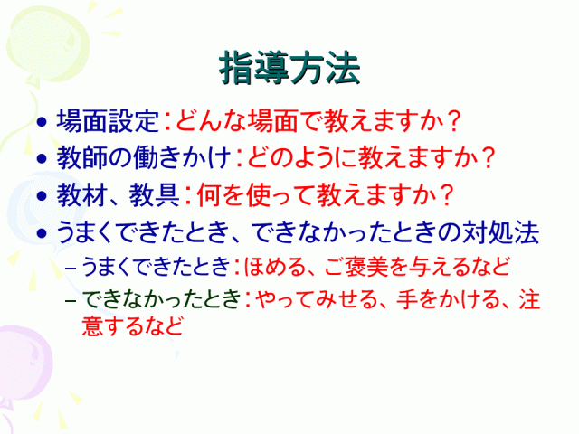 では出来なかった時は、やってみせる・手をかける・注意するなど。どの程度までお手伝いするかというのをあらかじめ決めておいた方がいいと思います。そうじゃないと、お父さんはいっぱい手をかけるけどお母さんはかけないとか、先生はあまり手をかけないけど同級生は女の子は徹底的にやってあげるとか、そのへんのガイドラインはちゃんとしてあげた方がいいと思います。