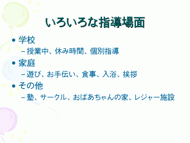 いろいろな指導場面と言いましたが、学校のなかでは授業、国語・算数・生活単元学習、休み時間などいろいろありますが、これはけっこう指導場面として有効なんです。子供はやりたがっていきいきしていますので「ちょうだい」の指導などはとても有効です。あとは個別指導の時間。家庭においては遊び・お手伝い・食事・入浴・挨拶、これは毎日必ずすることですから、かっこうの指導場面ですよね。挨拶というのは国語の時間にやるよりも朝夕の寝るとき・起きたときに教えるのが一番いいわけですし、体をこするというのは入浴の時間に教えるのがいいわけです。他にも塾・サークル・おばあちゃんの家・レジャー施設でも、教える機会がたくさんあります。こういうのはとってもいいわけです。なんでかというと目的がはっきりしています。塾へ何をしに行くか、言わなくても分かります。レジャー施設へ何をしに行くのかも分かります。プールへ行くと何をするのか、重い自閉症の子供でも分かります。そこで教えるものが限定されてきて特定化されやすいということです。